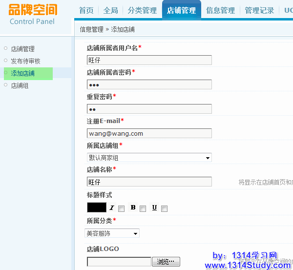 填写好要添加的店铺的店铺所属者用户名、密码、注册 E-mail、所属店铺组,店铺名称、标题样式、所属分类、LOGO、介绍、权限、地址、联系方式、申请人信息等信息后提交即可,带*号的选项为必填项。