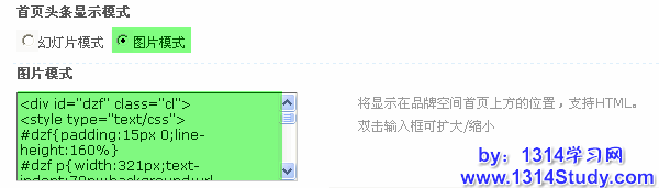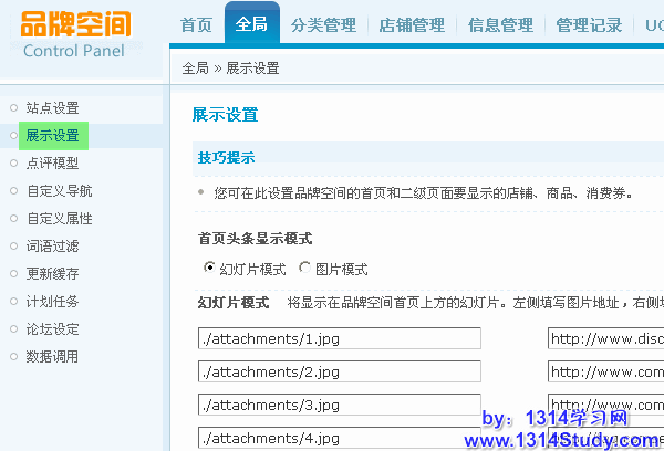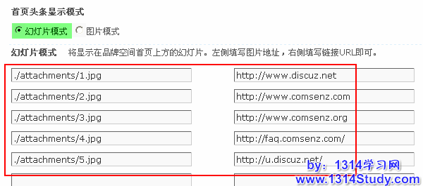 1、幻灯片模式,将显示在品牌空间首页上方的幻灯片。左侧填写图片地址,右侧填写链接URL即可。