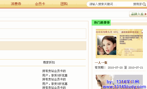 显示在品牌空间首页中间的位置,这里只要填写消费券的编号就可以,编号之间用英文逗号(,)分隔。系统根据您填写的编号顺序在前台显示。比如这里填写的是3,2,1,4,5,6 那么编号为3的消费券将显示在第一位。效果如下