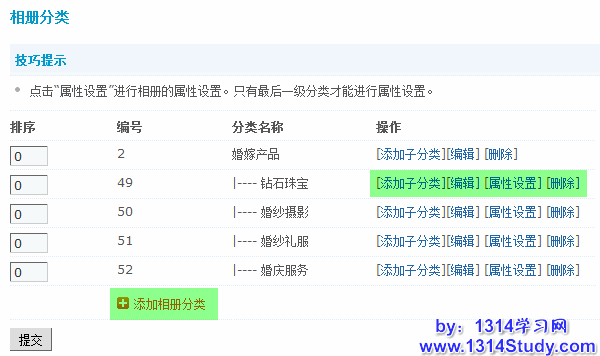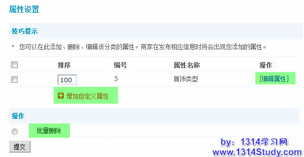 4、属性设置:可对相册分类的属性进行设置,需要注意的是只有最后一级分类才能进行属性设置,在属性设置中可以增加和编辑相册属性,也可以对相册属性进行批量删除。后台添加的属性将会在商家发布相应的信息时显示。