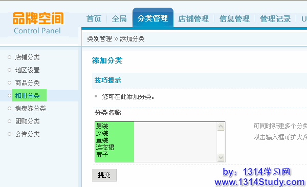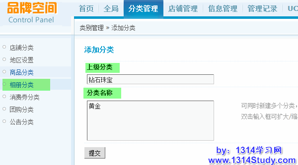1、添加相册分类:添加相册分类,品牌空间的相册分类支持无限制级分类。