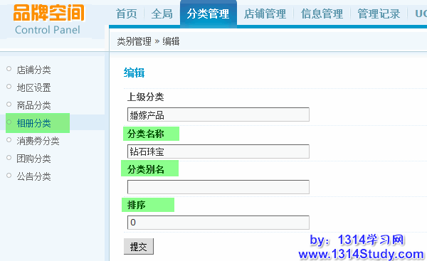 3、编辑:编辑该分类的名称、分类别名、及分类排序数。
