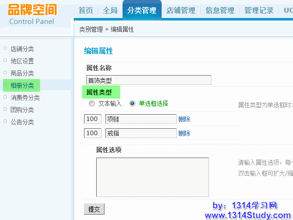 相册的属性类型分为文本输入的单选框选择两种,文本输入为商家在发布信息时提供输入框,由商家手动输入,单选框选择为后台已经设置好相应的选项,商家在发布信息时只需选择某一属性即可。并且只有属性类型为单选框时才能在搜索页面被检索。