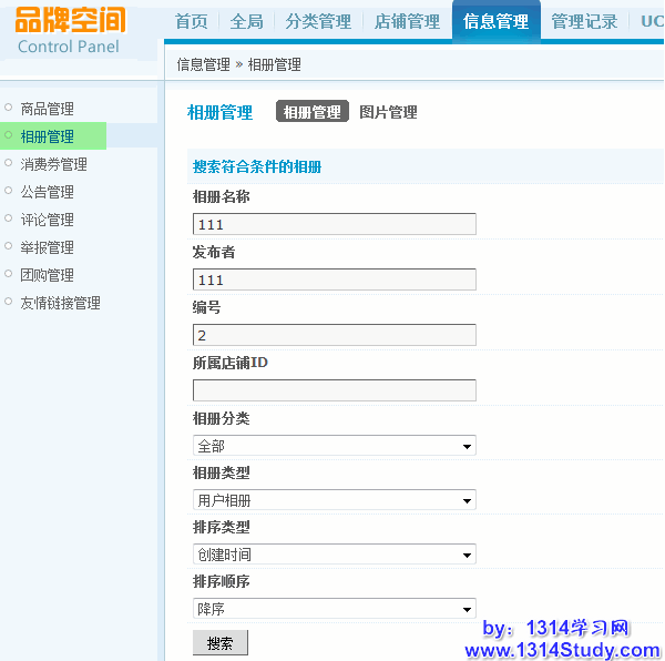 首先需要搜索出要进行管理的相册,系统提供的搜索选项包括相册名称、发布者、编号、所属店铺 ID、相册分类、相册类型等。