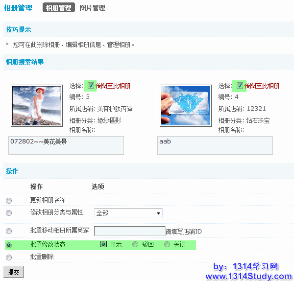 对搜索出符合管理条件的相册,可以对其进行的批量操作,包括更新相册名称、修改相册分类与属性、移动相册所属商家、修改状态及删除。进行批量操作时,只要勾选好要进行操作的相册,在“操作”中选中要进行的批量操作即可。