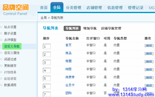 这里可以管理商家添加的自定义导航,如下图所示: