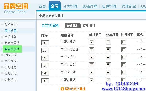 自定义属性主要用于在添加店铺的时候,一些必填的基本信息,如申请人姓名、申请人身份证、申请人手机、申请人座机、申请人住址以及申请人邮编等。在这里可以增加或者减少商铺属性,也可以设置为选填项,还可以设置为注册项目(即注册时需要填写的项目)同时也可以添加团购属性,下面主要讲解这个功能的使用方法。