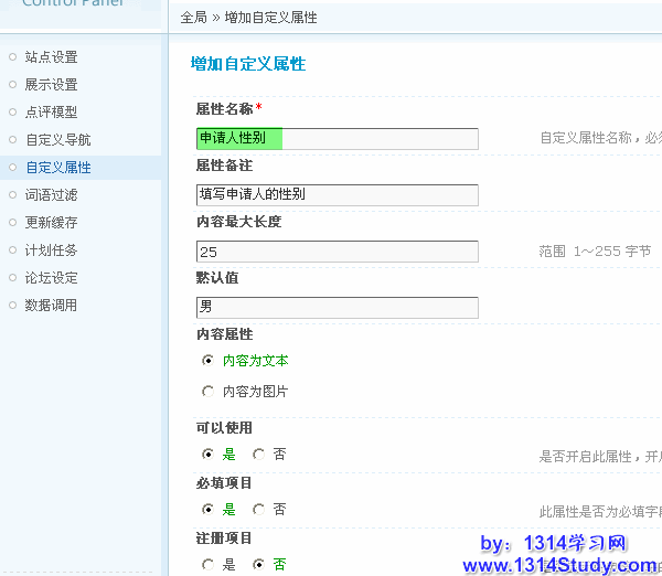 属性名称:为必填项目,如申请人性别,这里可以按照自己的站点情况具体填写。
