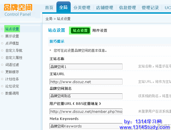管理员可在站点设置中设置品牌空间的基本信息,这个功能主要涉及到后台基本设置与品牌空间的前台显示效果有关的一系列设置。下面主要介绍一下这个功能的使用方法和注意事项。