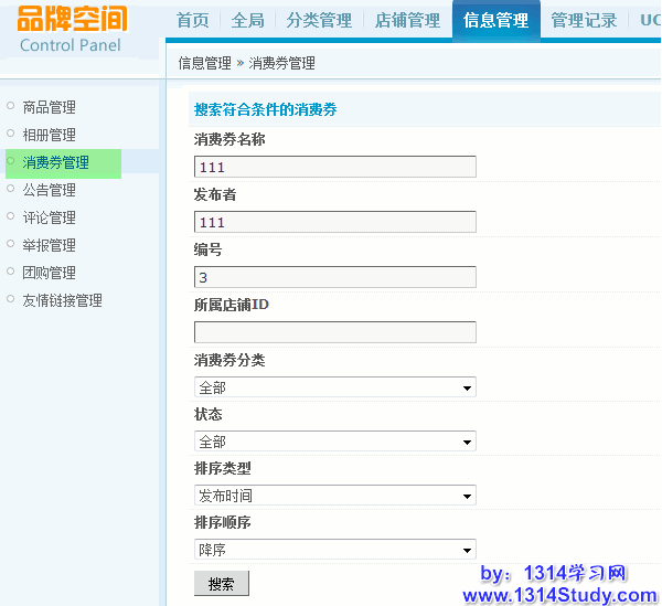管理位置:管理中心 => 信息管理 => 消费券管理