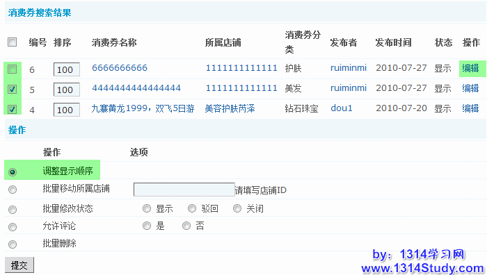 对搜索出符合管理条件的消费券,可以对其进行的批量操作,包括调整显示顺序,移动所属店铺、修改状态、设置是否允许评论、删除,进行批量操作时,只要勾选好要进行操作的消费券,在“操作”中选中要进行的批量操作即可。