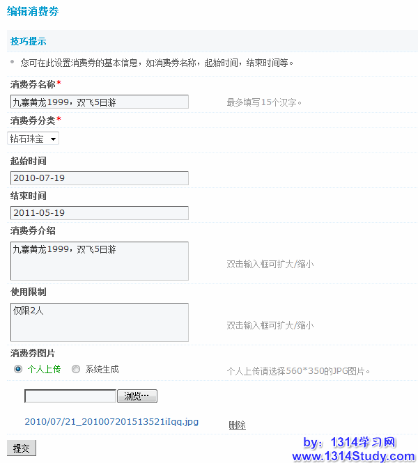 如果要对某一个消费券进行单独编辑,可以点击该消费券后的“编辑”选项,对消费券的名称、分类、介绍、使用信息、图片等进行调整,其中带*号的选项为必填项。