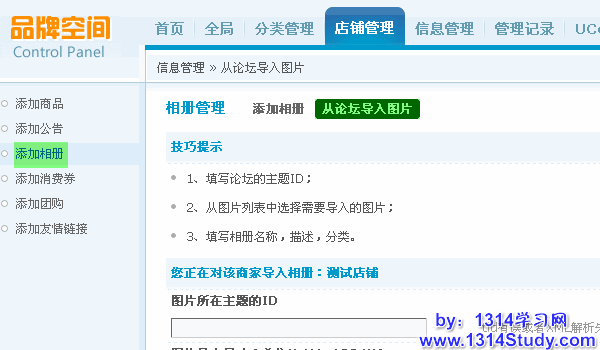 后台 => 店铺管理 => 选择符号条件的店铺 => 添加相册 => 从论坛导入图片,如下图所示: