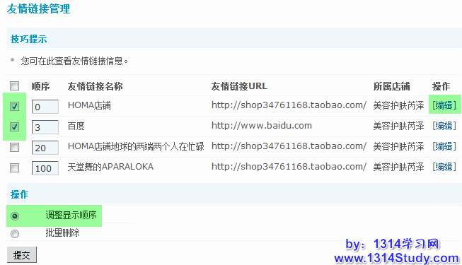 对搜索出符合管理条件的友情链接,可以对其进行的批量操作,包括调整显示顺序和删除。进行批量操作时,只要勾选好要进行操作的友情链接,在“操作”中选中要进行的批量操作即可。