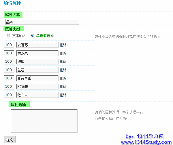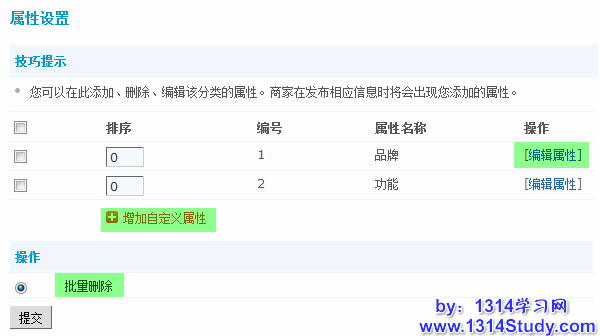 4、属性设置:可对商品分类的属性进行设置,需要注意的是只有最后一级分类才能进行属性设置,在属性设置中可以增加和编辑商品属性,也可以对商品属性进行批量删除。后台添加的属性将会在商家发布相应的信息时显示。
