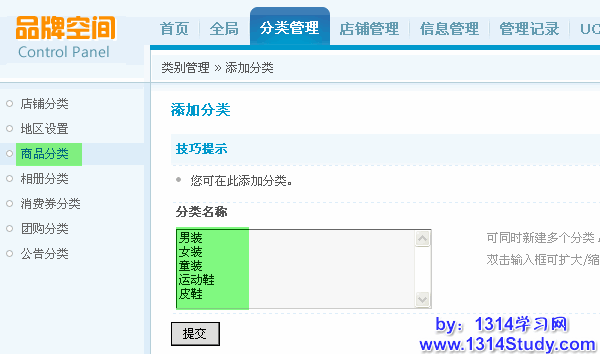 站长可以在此项中设置品牌空间中的商品分类,操作包括添加、删除、管理商品分类和设置商品分类属性。