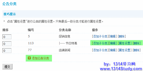 5、删除:删除公告的分类。需要注意的是,当要删除的分类下有子分类时,要先将该分类下的子分类转移到其他分类后才能删除该分类。