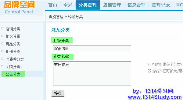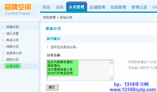 1、添加公告分类:添加公告分类,品牌空间的公告分类支持无限制级分类。