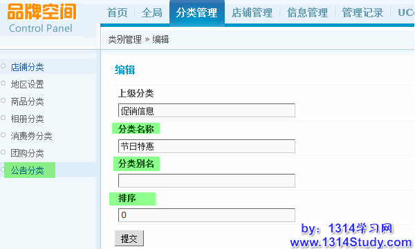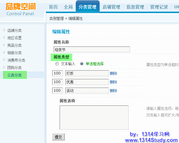 站长可以在此项中设置品牌空间中的公告分类,操作包括添加、删除、管理公告分类和设置公告分类属性。