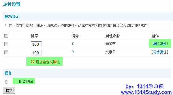 4、属性设置:可对公告分类的属性进行设置,需要注意的是只有最后一级分类才能进行属性设置,在属性设置中可以增加和编辑公告属性,也可以对公告属性进行批量删除。后台添加的属性将会在商家发布相应的信息时显示。