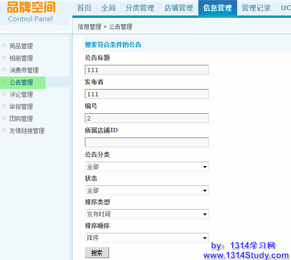 首先需要搜索出要进行管理的公告,系统提供的搜索选项包括公告标题、发布者、编号、所属店铺 ID、公告分类、状态等。
