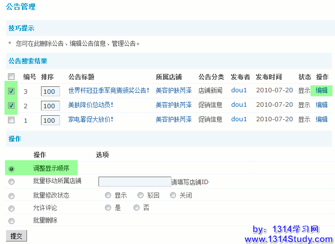对搜索出符合管理条件的公告,可以对其进行的批量操作,包括调整显示顺序,移动所属店铺、修改状态、设置是否允许评论、删除。进行批量操作时,只要勾选好要进行操作的公告,在“操作”中选中要进行的批量操作即可。