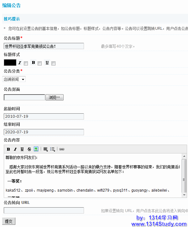 如果要对某一个公告进行单独编辑,可以点击该公告后的“编辑”选项,对公告的标题、标题样式、分类、封面、内容,转向URL等进行调整,其中带*号的选项为必填项。