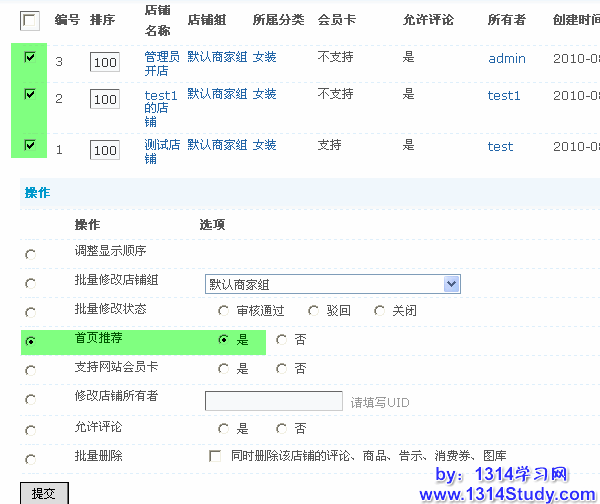 在这里搜索符合条件的店铺,然后选择好搜索到的店铺,首页推荐,选择“是”,如下图所示: