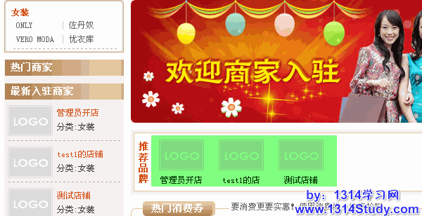 提交后,这些推荐的店铺就会显示在首页推荐品牌一栏,效果如下图所示: