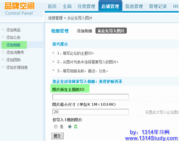 如果需要从论坛导入图片,可以填写图片所在的主题 UID 后导入。需要注意的是,使用此功能需要配合 Discuz!6.1 至 7.2 的版本。