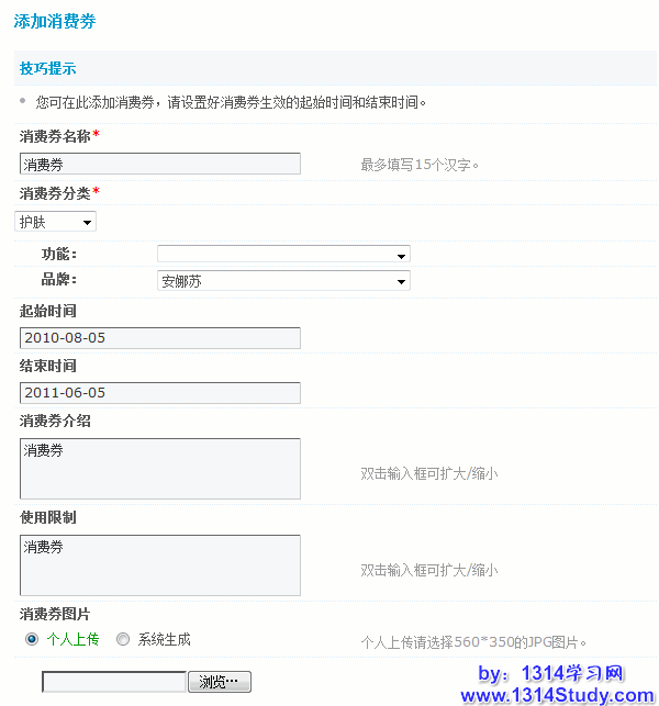 此处可以发布该店铺中的消费券,填写好消费券的名称、分类、介绍、使用限制、图片等信息后提交即可,带*号的选项为必填。