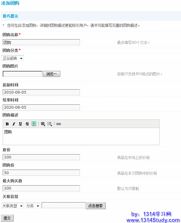 此处可以发布该店铺中的团购消息,填写好团购名称、分类、图片、描述、价格、最大购买数和关联信息等后提交即可,带*号的选项为必填。