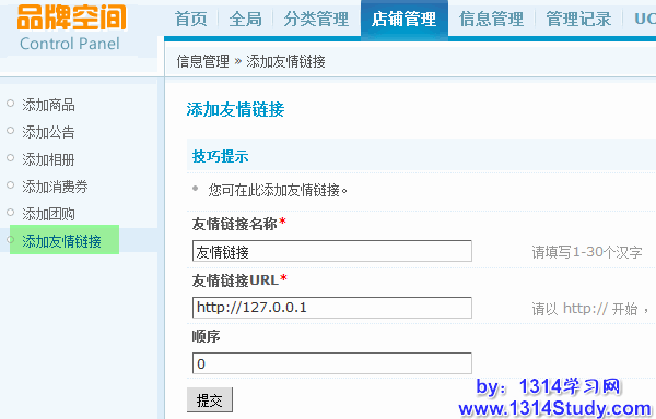 此处可以为该店铺添加友情链接,以增强与其他店铺或是站点之间的商家联系。填写好以友情链接的名称、URL 和显示顺序后提交即可,带*号的选项为必填。