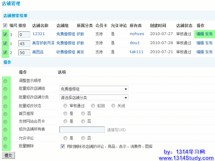 当搜索出符合要求的店铺后,可以对店铺的显示顺序、所在店铺组、所在店铺分类、状态、是否首页推荐、是否支付网站会员卡、店铺所有者、是否允许评论等进行批量设置和对店铺进行批量删除。也可以对某一个店铺进行单独管理时,操作包括编辑店铺信息和发布店铺内容。