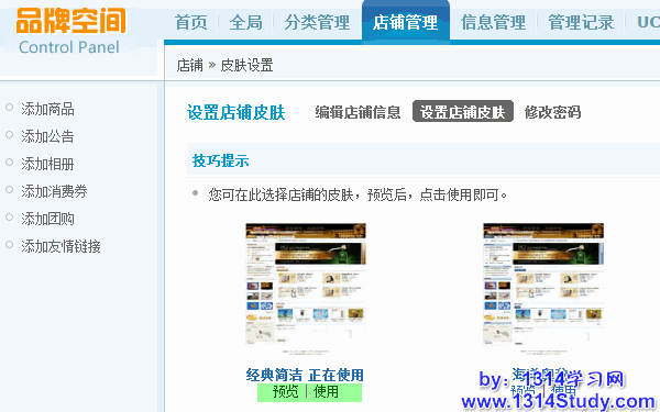 此处可以设置店铺在前台的显示样式,系统内置经典简洁和海洋奥秘两种皮肤,可以根据实际需要选择适合的皮肤。