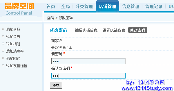 当商家忘记了自已的店铺密码时,站长可以在此处为商家设置新密码,填写新密码并再次确认输入新密码后即可。