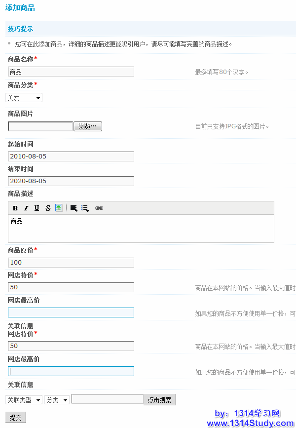 此处可以发布该店铺中的商品,填写好商品名称、分类、图片、描述、商品原价、网店特价和关联信息等各项商品信息后提交即可,带*号的选项为必填。