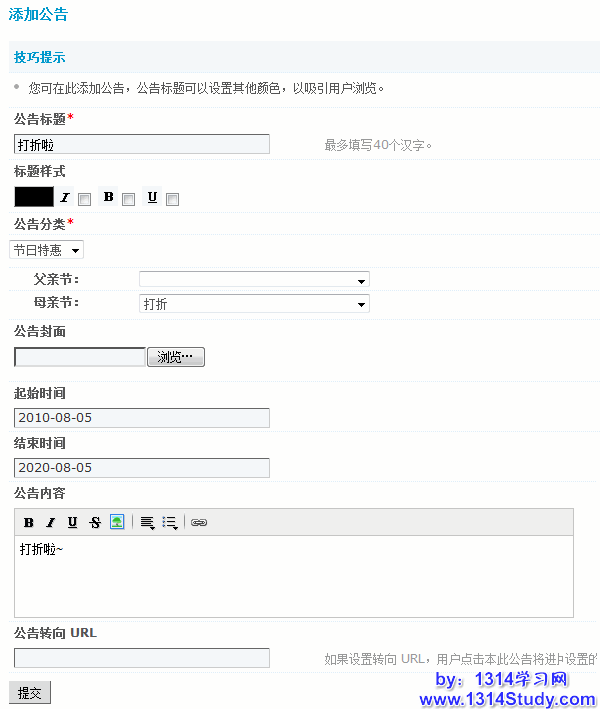 此处可以发布该店铺中的公告,填写好公告的标题、样式、分类、封面、内容等提交即可,带*号的选项为必填。