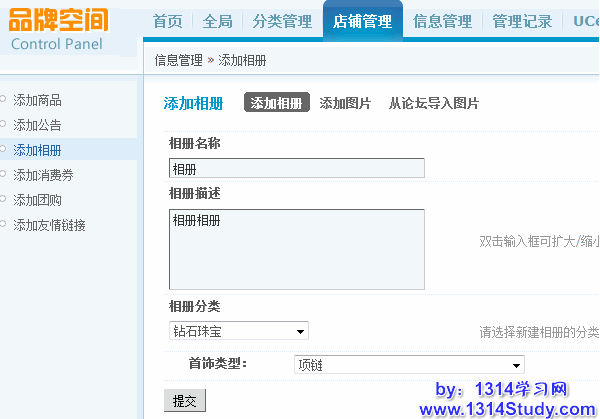 此处可以为该店铺填加店铺用相册,填写好相册名称、描述和分类后提交即可。