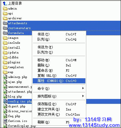 1、上传 Discuz! 5.0(除install.php文件外)的所有程序文件到服务器覆盖原 Discuz!4.1 程序,并修改 attachments、customavatars 、forumdata 、./forumdata/cache 、./forumdata/templates 、./forumdata/threadcaches 、templates 的目录属性为777。如图 7、8、9 所示: