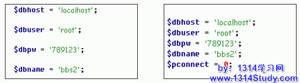 右边为新上传的 Discuz!5.5 版本的config.inc.php文件的数据库信息。