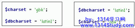 注:左图为 Discuz!5.0 的config.inc.php 中的论坛字符集和数据库字符集的配置;