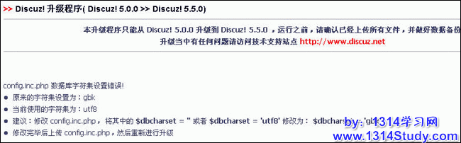 错误分析:config.inc.php 文件中的 $dbcharset 这一项没有配置正确,Discuz!5.5 的升级程序增加升级前论坛和新版本字符集检测机制,如果您上传的新版本的数据库字符集和升级前论坛的数据库字符集不一致,程序将会检测出各自的数据库字符集,提醒您调整字符集配置,避免升级完乱码问题的出现。