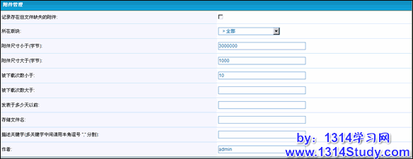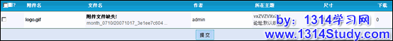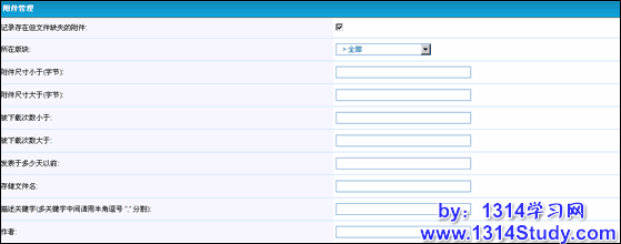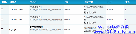 我们可以选中某个附件名称前面的复选框,如果删除所有搜索到的附件,可以点左上角的复选框实现全部选中,然后提交删除该附件,这里的删除包括删除附件在数据的信息和真实的附件文件;还可以点某个附件名称后面的“下载该附件”链接下载该附件;或者点某个附件名称后面,所在主题一栏的主题名称,打开附件所在主题。