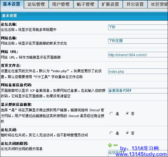 说明:这个功能主要涉及到后台基本设置与论坛的前台显示效果有关的一系列设置。下面主要介绍一下这个功能的使用方法和注意事项。