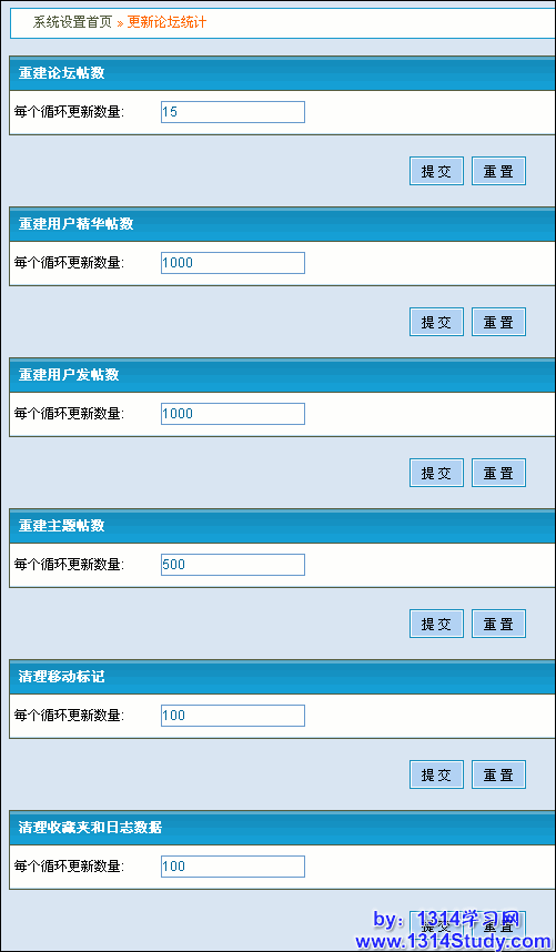 这就是以上六个项目的主要的功能,那么更新统计之前,都有个每个循环更新数量的设置,这个设置主要是为了防止一次更新太多,完成时间太长导致服务器超时而设置的,这样每次执行你设置的数目,然后自动跳转分批执行。