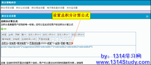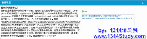 总积分是衡量用户级别的唯一标准,积分公式根据每个论坛的实际情况进行设置。举一例说明:每个会员的积分值=会员贴子数+会员在线时间*10。公式里的每个参数都有专门的表达式代替:posts 代表发帖数;digestposts 代表精华帖数;oltime 代表用户总在线时间(小时);pageviews 代表用户总页面访问量;extcredits1~extcredits8 分别代表8 个自定义积分。