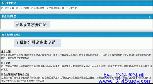 “积分策略向导”分为5个部分:积分项目设置、积分公式设置、积分用途设置、电子商务基本设置和支付宝设置。