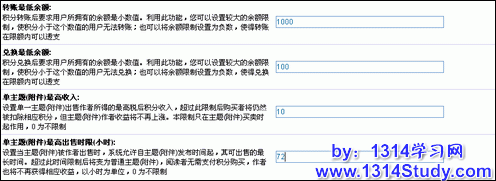 站长在系统设置里,可以分别设置:转账最低余额,兑换最低余额,单主题(附件)最高收入,单主题(附件)最高出售时限(小时)。