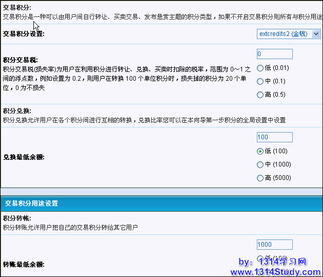 积分交易主要包含开启哪个为交易积分、交易税,积分兑换主要设置的是兑换的最低余额。